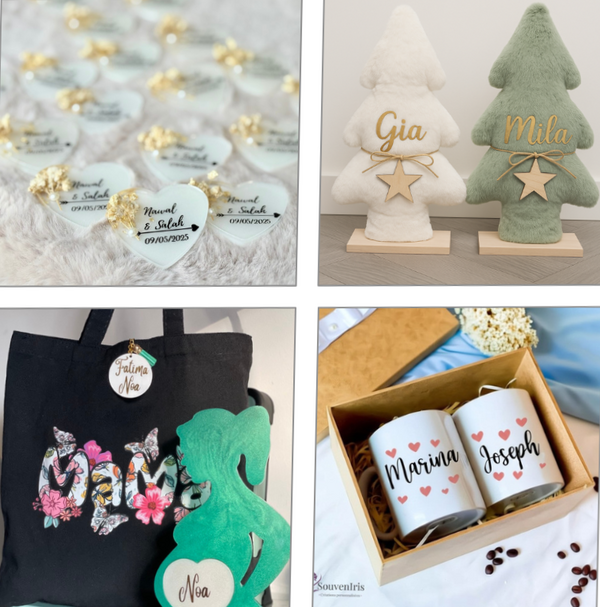 Cadeaux personnalisésPour toutes les occasions : anniversaires, naissances, mariages, fêtes, baptêmes, fin d’année scolaire, etc.Mugs, tote bags, trousses, porte-clés, cadres, décorations, et bien plus encore.